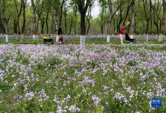 4月17日,市民在京城森林公園內(nèi)散步休閑。
