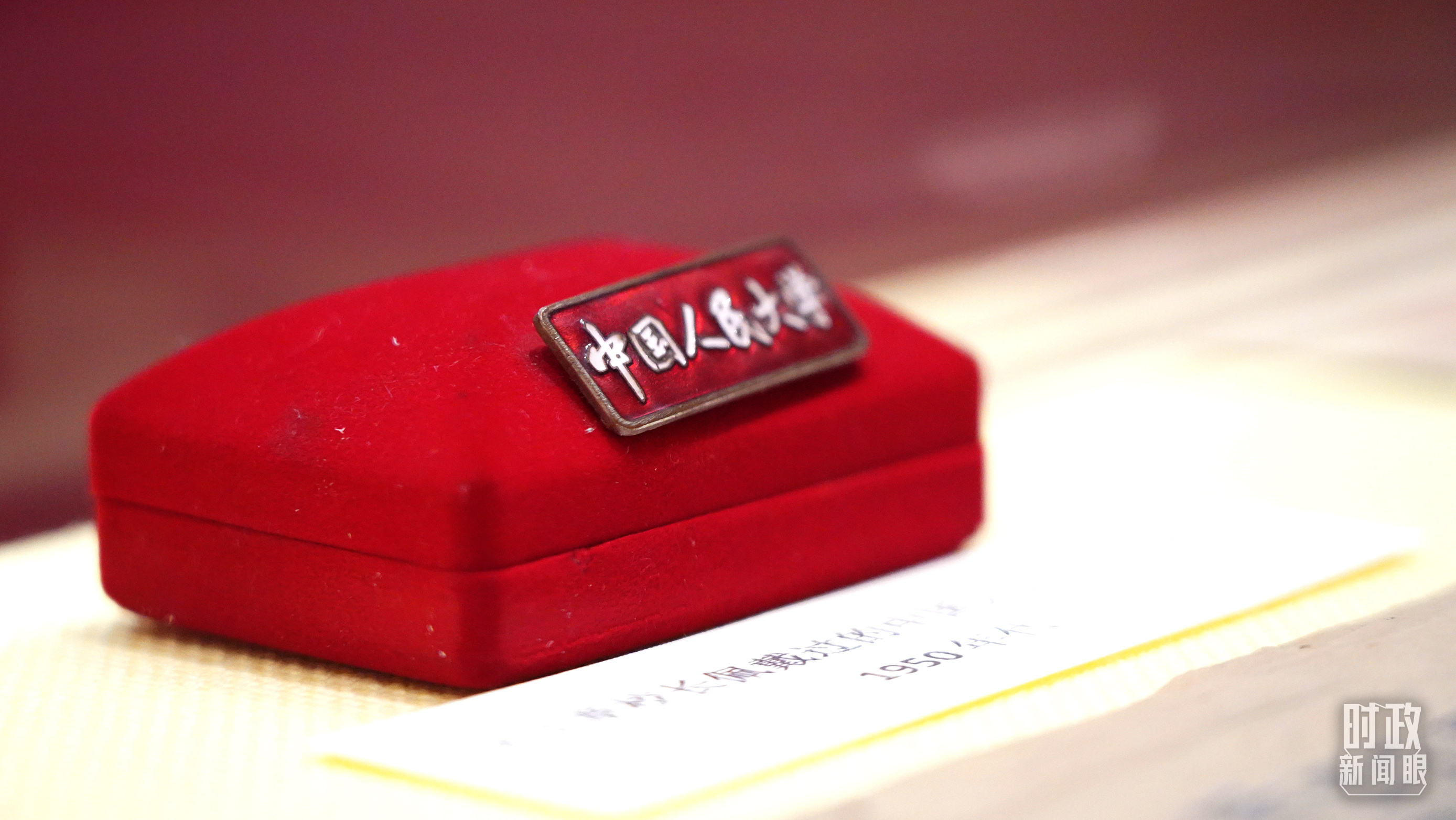 △校史展上,吳玉章校長佩戴過的中國人民大學(xué)?;?。(總臺央視記者彭漢明拍攝)