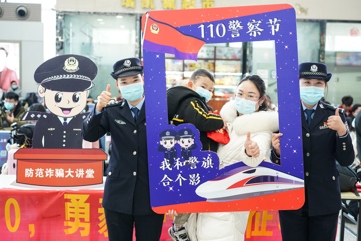 南京鐵路公安處聯(lián)合南京市公安局公交治安分局在南京火車站舉行迎接“中國人民警察節(jié)”活動,民警和旅客在活動上合影(2022年1月7日攝)。新華社記者 季春鵬 攝