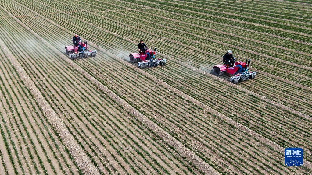 2月17日,在山東省聊城市莘縣妹冢鎮(zhèn),農民在麥田里進行鎮(zhèn)壓保墑作業(yè)(無人機照片)。新華社記者 郭緒雷 攝