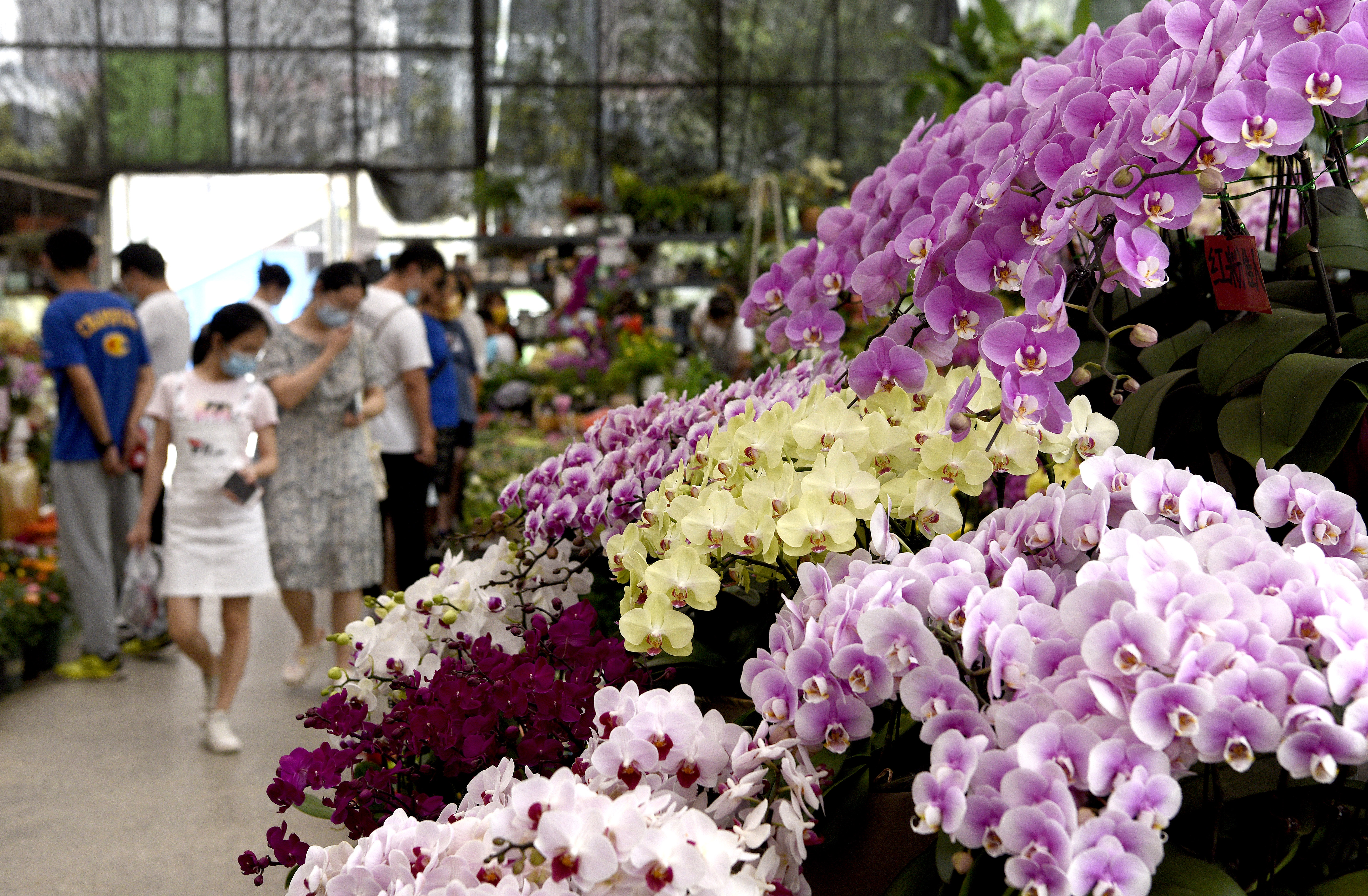 市民在西安際華3511文創(chuàng)科技園內(nèi)的花市挑選花卉(5月20日攝)。 新華社記者 劉瀟 攝