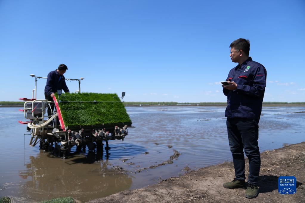 在北大荒集團(tuán)建三江分公司七星農(nóng)場有限公司萬畝稻田邊,農(nóng)機(jī)手陸向?qū)нB續(xù)輕觸兩下手機(jī),一臺(tái)帶有北斗導(dǎo)航系統(tǒng)的無人駕駛插秧機(jī)開始作業(yè)。