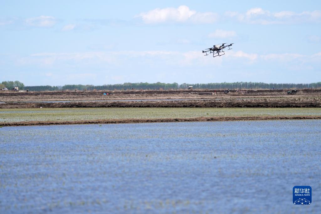 無人機(jī)在北大荒集團(tuán)七星農(nóng)場有限公司一塊稻田中作業(yè)(5月18日攝)。新華社記者 王建威 攝