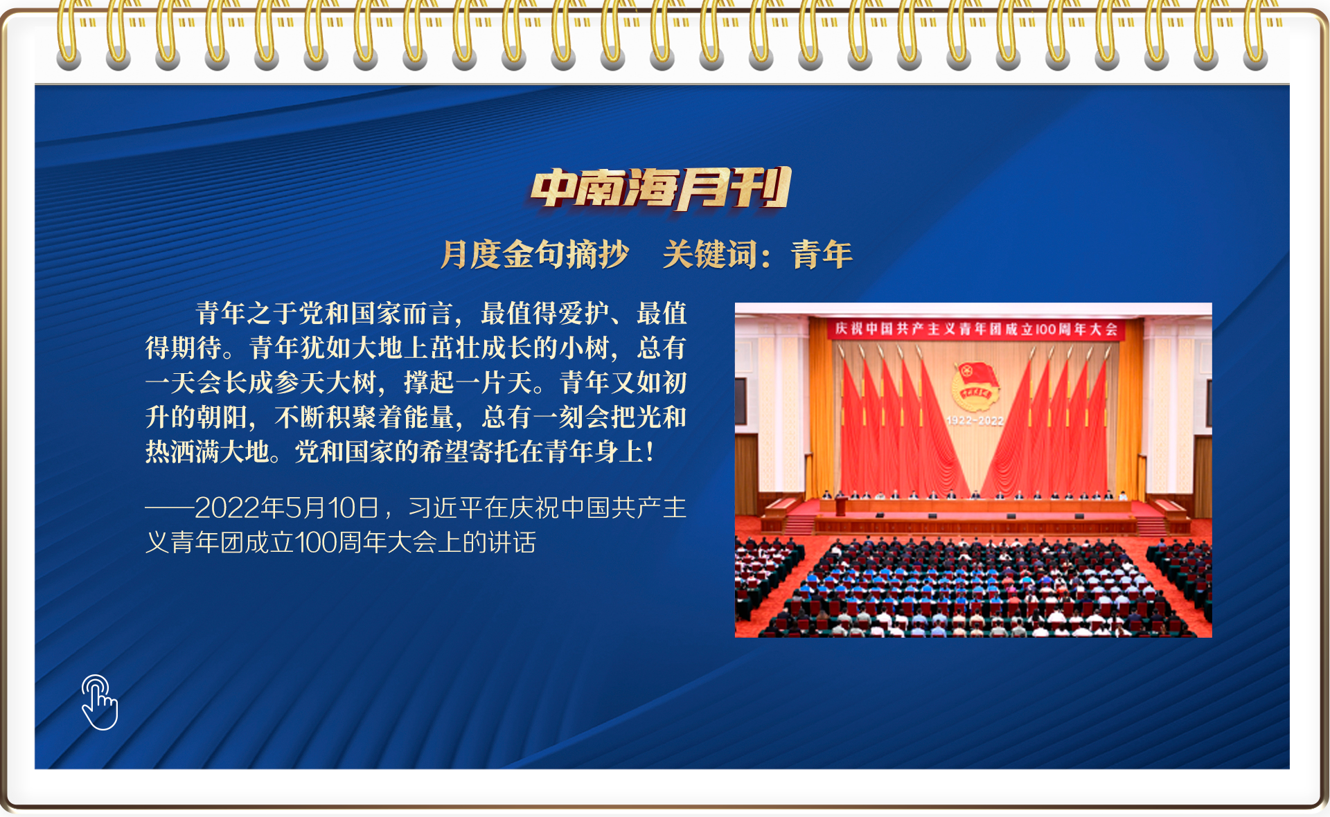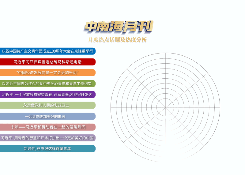 央視網(wǎng)“智聞”系統(tǒng)提取分析了2022年5月全網(wǎng)時(shí)政新聞熱點(diǎn),慶祝中國共產(chǎn)主義青年團(tuán)成立100周年大會(huì)備受網(wǎng)友關(guān)注,與之關(guān)聯(lián)的“以習(xí)近平同志為核心的黨中央關(guān)心青年和青年工作紀(jì)實(shí)”“用青春的智慧和汗水打拼出一個(gè)更加美好的中國”“新時(shí)代,總書記這樣寄望青年”等話題熱度很高。