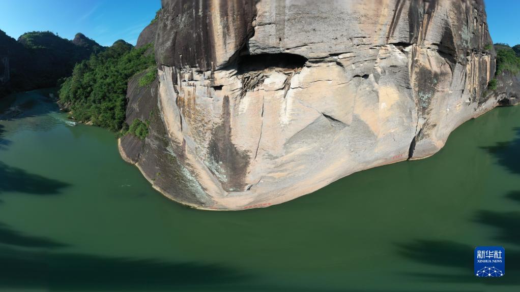 武夷山九曲溪畔丹霞石壁上的架壑船棺(6月6日攝,無人機照片)。架壑船棺和虹橋板是當(dāng)?shù)毓砰}族的葬俗遺跡。新華社記者 姜克紅 攝