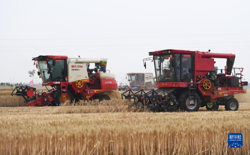 這是5月26日在河南省南陽市唐河縣湖陽鎮(zhèn)張灣村拍攝的小麥機(jī)收減損技能大比武現(xiàn)場。新華社記者 張浩然 攝