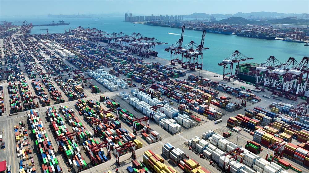 繁忙的山東港口青島港前灣港區(qū),集裝箱貨輪在裝卸集裝箱(6月15日攝,無人機照片)。青島海關(guān)數(shù)據(jù)顯示,今年1月至5月,青島直達金磚國家的航線共完成箱量83萬標(biāo)箱,同比增長12%,其中出口量增長26.1%。新華社記者 李紫恒 攝