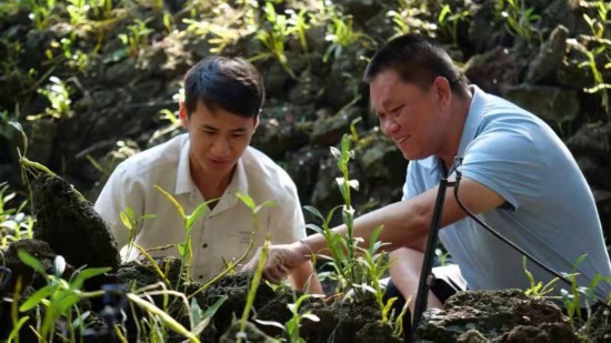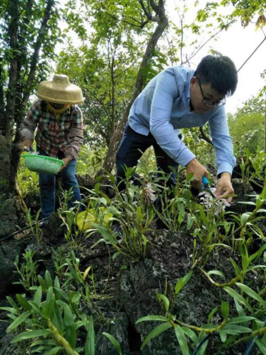 吳清偉帶領(lǐng)員工修剪火山石斛。受訪者供圖