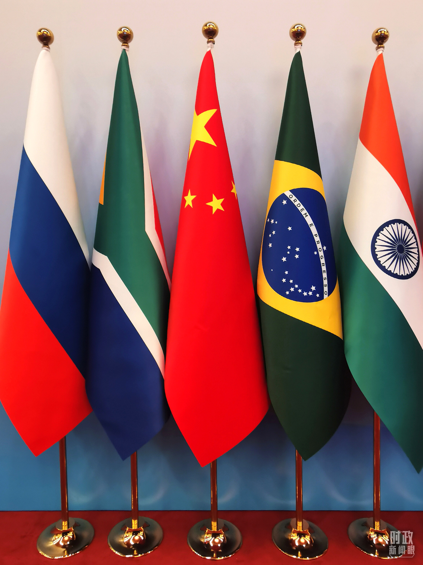 中方會場設(shè)在北京人民大會堂東大廳。走進(jìn)會場,金磚五國的國旗與紅花綠葉交相輝映。