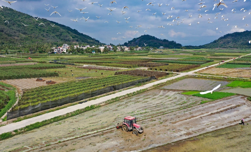 ↑海南省陵水黎族自治縣光坡鎮(zhèn)的農(nóng)民在田間勞作(2021年4月5日攝,無人機(jī)照片)。