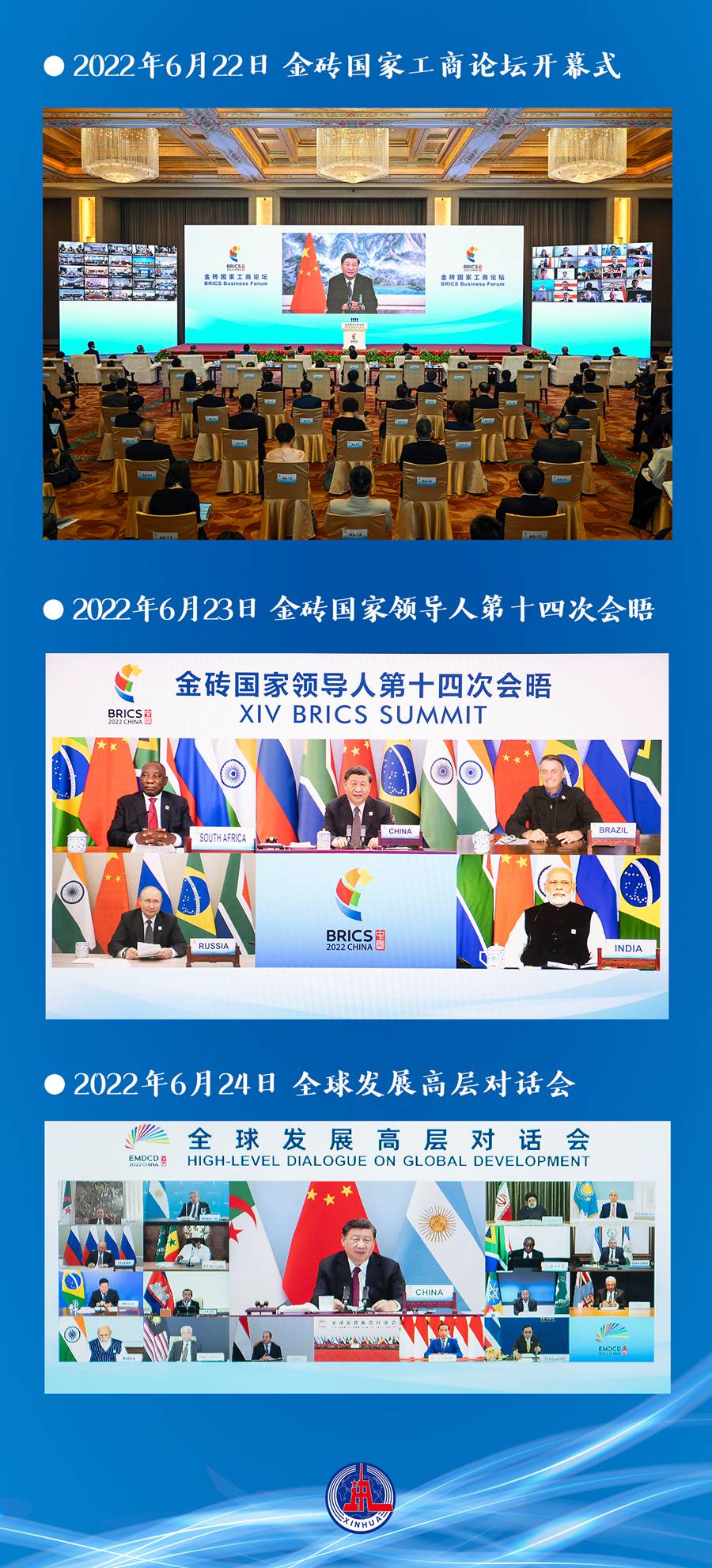 6月22日至24日,金磚“中國年”的高光時段,連續(xù)三個晚上,習近平主席以視頻方式相繼出席金磚國家工商論壇開幕式,主持金磚國家領導人第十四次會晤、全球發(fā)展高層對話會。
