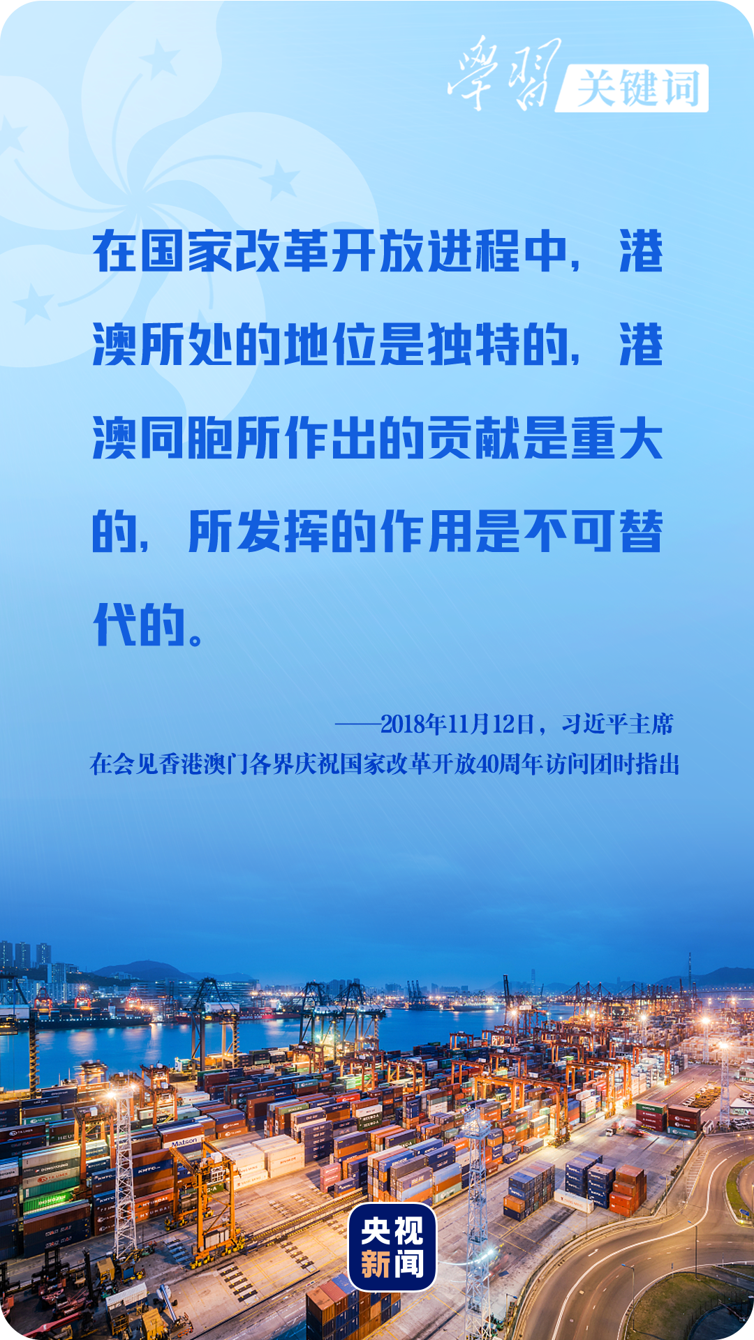 “香港背靠祖國、面向世界,有著許多有利發(fā)展條件和獨(dú)特競爭優(yōu)勢。特別是這些年國家的持續(xù)快速發(fā)展為香港發(fā)展提供了難得機(jī)遇、不竭動(dòng)力、廣闊空間。”2017年7月1日,習(xí)近平主席在慶祝香港回歸祖國二十周年大會(huì)暨香港特別行政區(qū)第五屆政府就職典禮上堅(jiān)定地說。