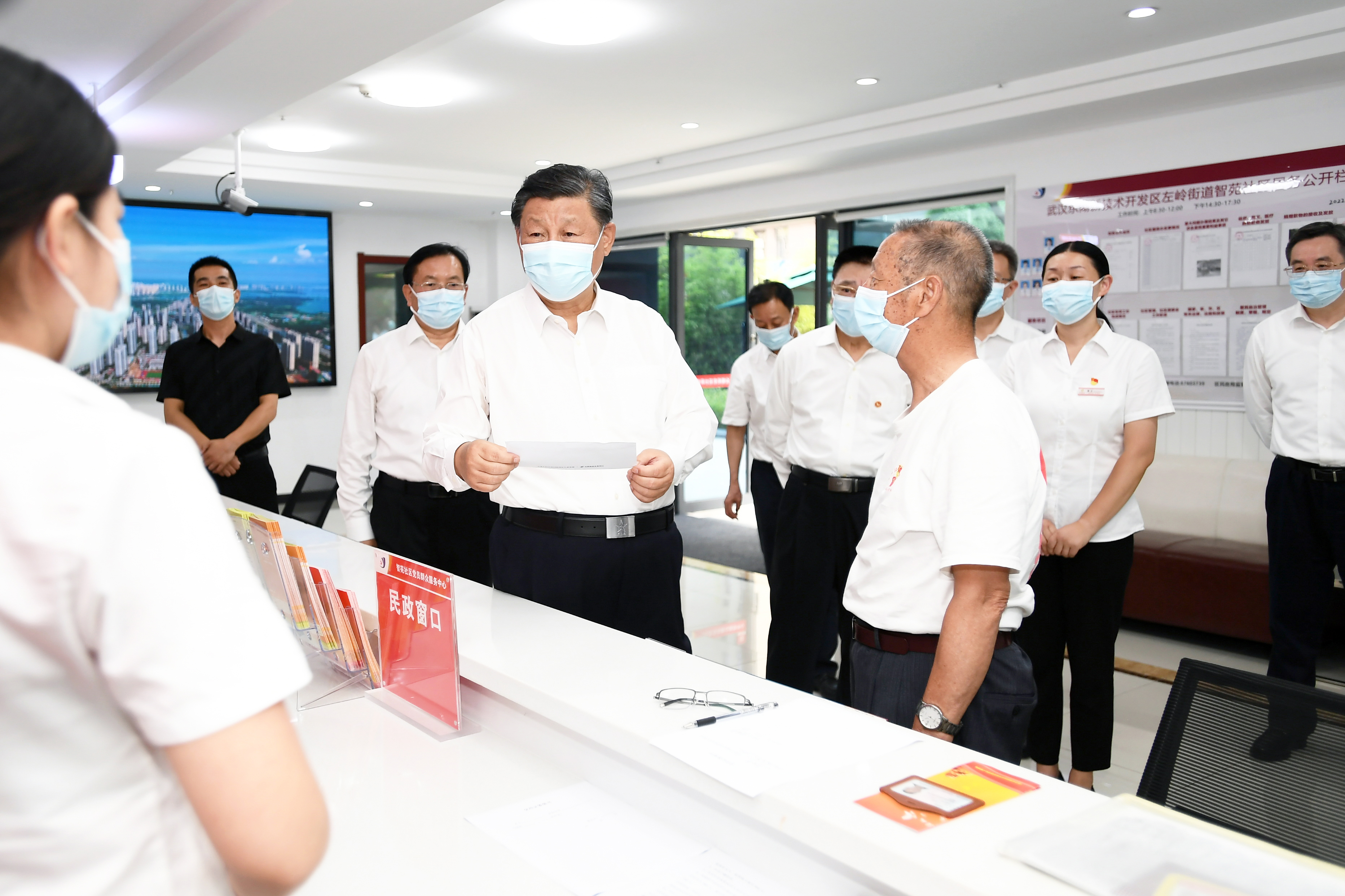 6月28日,中共中央總書記、國家主席、中央軍委主席習近平在湖北省武漢市考察。這是28日下午,習近平在東湖高新區(qū)左嶺街道智苑社區(qū)志愿服務客廳,向社區(qū)工作者、下沉黨員干部、志愿者了解基層疫情聯(lián)防聯(lián)控機制運行情況。