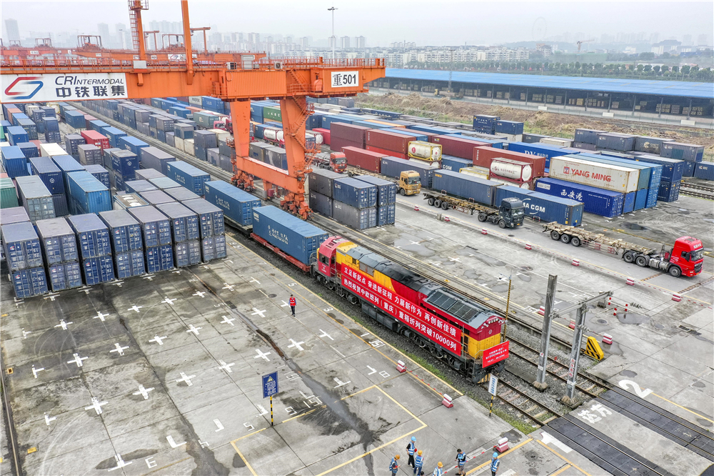中歐班列(重慶)第10000列列車(chē)在重慶團(tuán)結(jié)村中心站等待發(fā)車(chē)(2022年6月23日攝,無(wú)人機(jī)照片)。新華社記者 黃偉 攝
