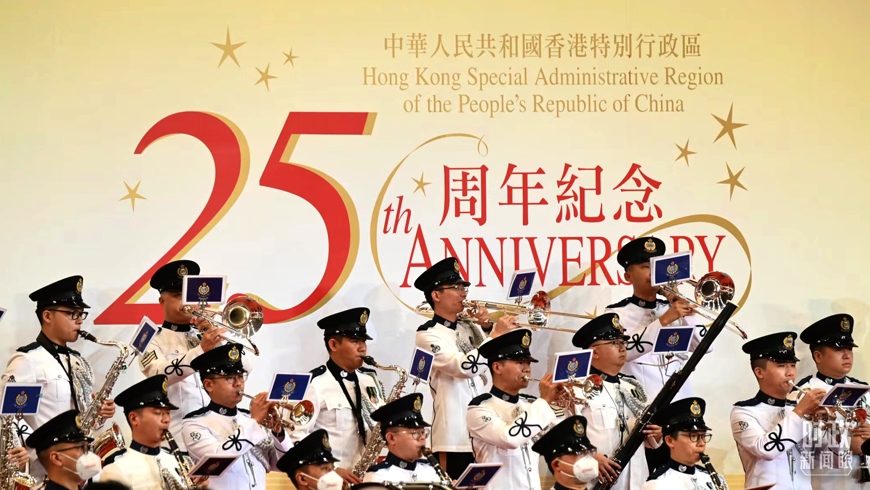 △慶祝大會現(xiàn)場的香港警察樂隊。(總臺記者孫楠拍攝)