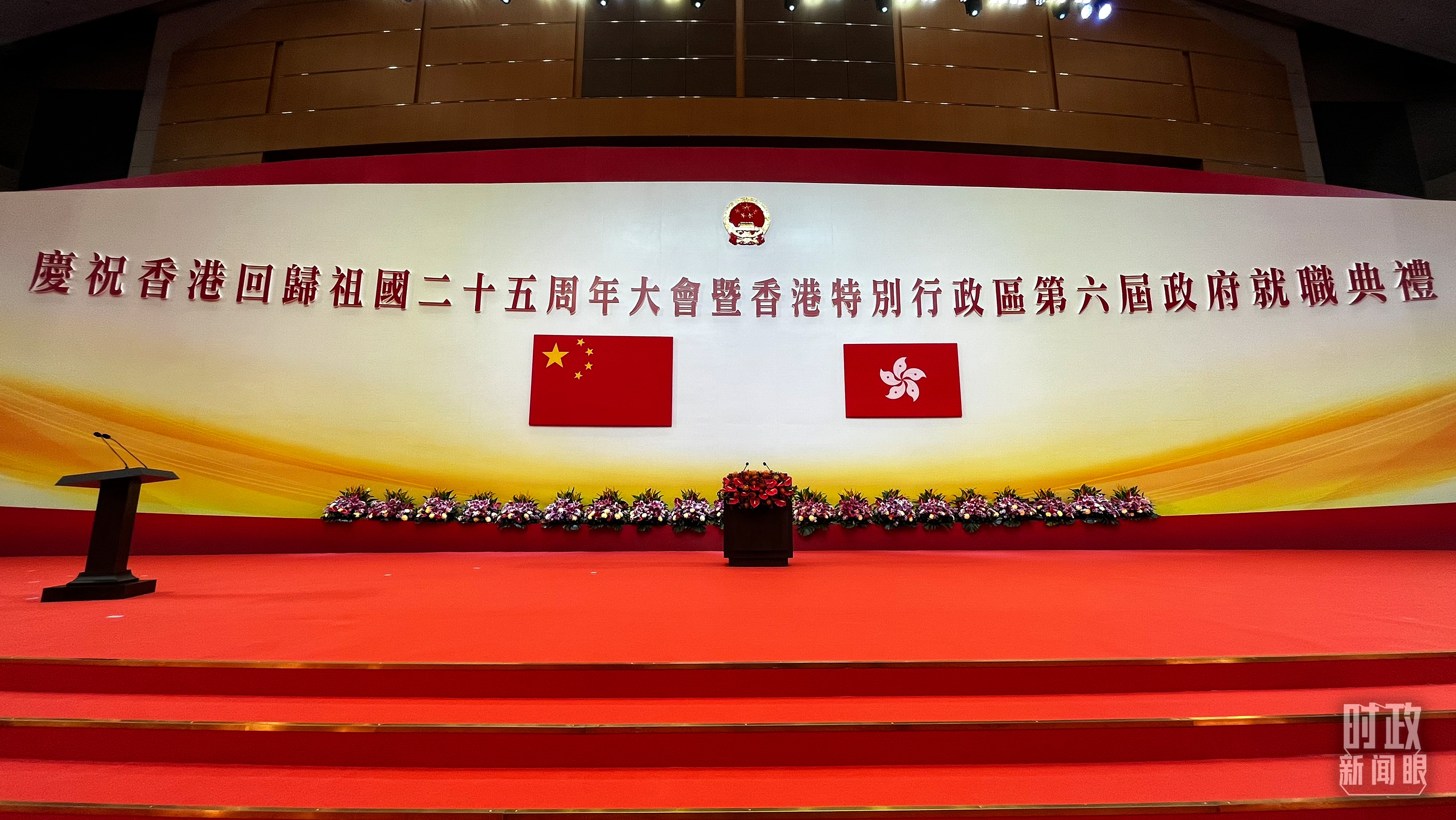 △這是慶祝大會暨就職典禮開始前的現(xiàn)場。香港特區(qū)2021年10月8日正式刊憲生效的《國旗及國徽(修訂)條例》列明,行政長官、主要官員、司法、行政會議、立法會和區(qū)議會宣誓儀式須展示國旗和國徽。(總臺央視記者王志明拍攝)