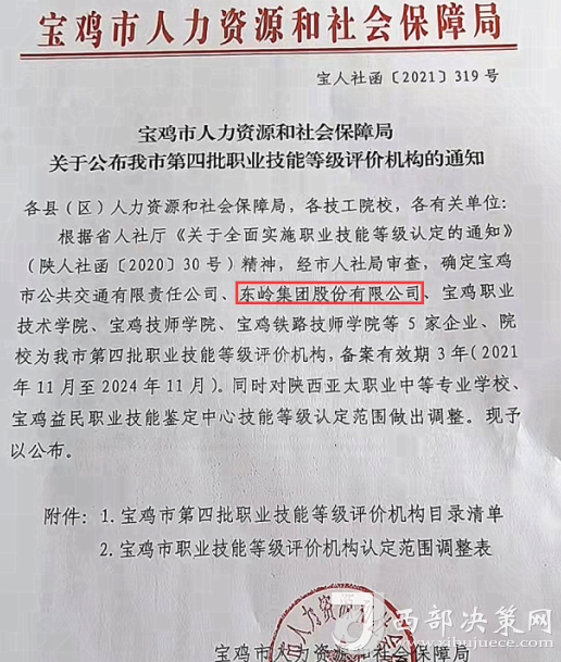 為了建立技能人才培養(yǎng)管理的長效機(jī)制,東嶺集團(tuán)積極與省市人社等相關(guān)部門對接,積極創(chuàng)造內(nèi)部條件,于2021年取得了“寶雞市第四批職業(yè)技能等級評價機(jī)構(gòu)”認(rèn)證資質(zhì),公司可以自主開展技能人才評價工作,頒發(fā)與國家職業(yè)資格證書同等效用的職業(yè)技能等級證書。取得證書后的學(xué)員,除了政府有1500元(中級)、2000元(高級)的現(xiàn)金補(bǔ)貼,公司也會根據(jù)實際情況提薪升職。
