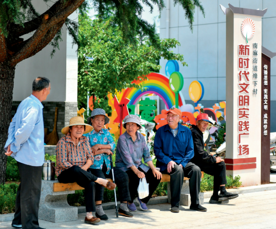 2022年6月15日,山東省沂源縣南麻街道埠下村村民在民生綜合體活動廣場休息。自2021年以來,沂源縣建設(shè)多處以老年食堂、公共浴室、中心村衛(wèi)生室(便民藥店)、便民超市為主體,其他服務(wù)功能相補(bǔ)充的多位一體民生綜合體 朱崢攝 / 本刊