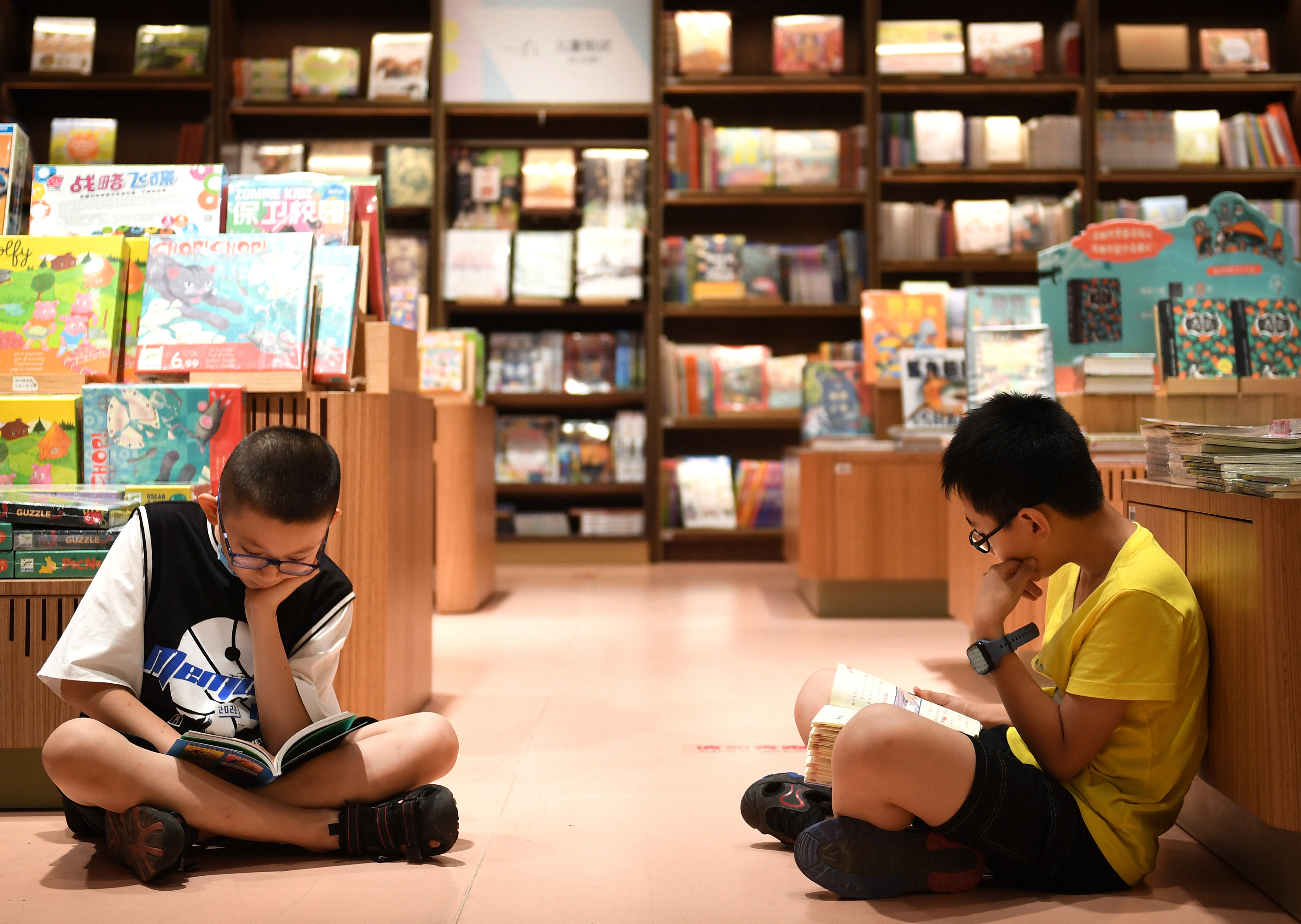 7月12日,在西安市蓮湖區(qū)一書店內(nèi),兩名小朋友在閱讀。新華社發(fā)(鄒競一 攝)