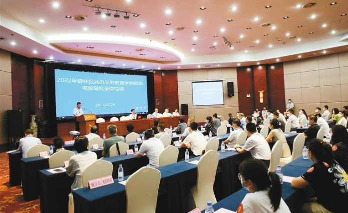 7月24日上午,我市各相關區(qū)縣、開發(fā)區(qū)統(tǒng)一實施民辦義務教育學校電腦隨機錄取工作。本報記者作為媒體監(jiān)督員,來到位于雍村飯店的碑林區(qū)民辦義務教育學校招生電腦隨機錄取工作現(xiàn)場,實地觀察體驗“搖號”全過程。