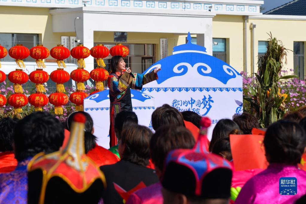2020年9月29日,在內(nèi)蒙古自治區(qū)興安盟科爾沁右翼中旗烏遜嘎查分會場的“我們的中國夢”——文化進(jìn)萬家慰問演出上,歌手圖雅娜莎(后)在演唱歌曲《牧民歌唱共產(chǎn)黨》。新華社記者 徐欽 攝