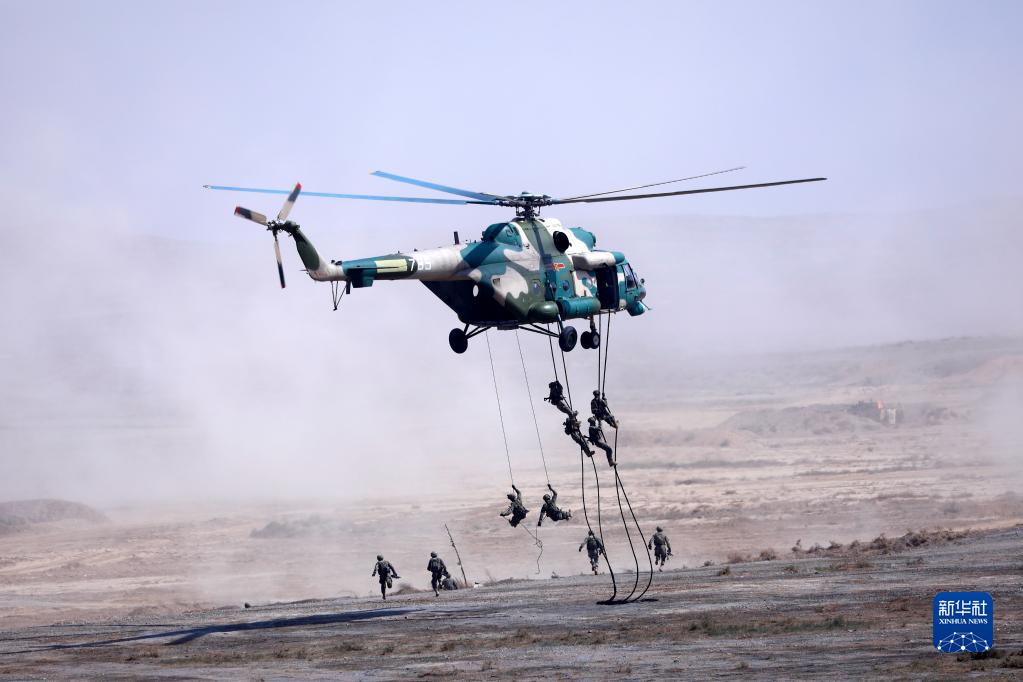 2021年8月13日,在寧夏某合同戰(zhàn)術(shù)訓(xùn)練基地“西部·聯(lián)合-2021”第二階段聯(lián)合實(shí)兵行動(dòng)演練中,運(yùn)輸直升機(jī)搭載陸軍特戰(zhàn)小隊(duì)至預(yù)定區(qū)域,特戰(zhàn)隊(duì)員實(shí)施索降。新華社記者 劉芳 攝
