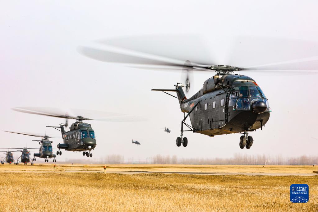 北部戰(zhàn)區(qū)陸軍第80集團(tuán)軍某陸航旅攻擊直升機(jī)與運(yùn)輸直升機(jī)組成大機(jī)群編隊(duì)進(jìn)行跨晝夜飛行訓(xùn)練(2022年2月11日攝)。新華社發(fā)(劉雨辰 攝)