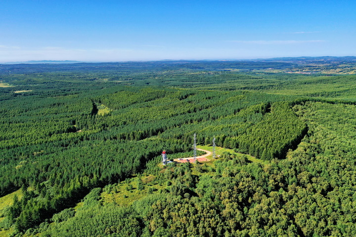 這是2021年8月23日拍攝的河北塞罕壩機械林場內的望海樓(無人機照片)。三代塞罕壩林場人50多年堅持植樹造林,用汗水澆灌出綠波涌動的百萬畝人工林海。 新華社記者 牟宇 攝