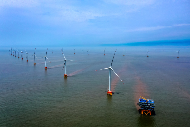 2021年5月16日拍攝的浙江舟山北部海域的中廣核岱山4號海上風電場(無人機照片)。新華社發(fā)(姚峰 攝)