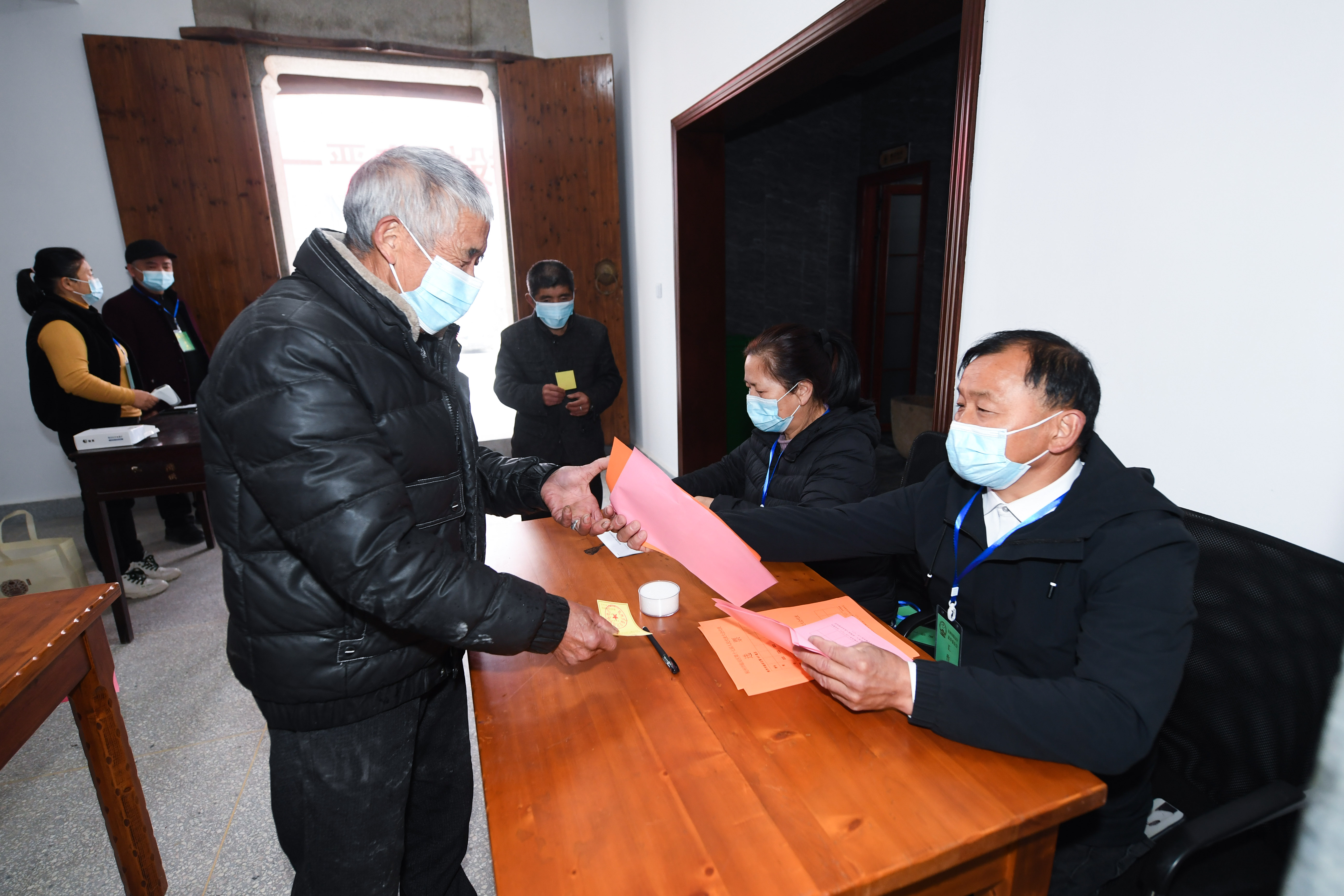 村民在浙江省杭州市臨安區(qū)湍口鎮(zhèn)迎豐村的基層投票點領(lǐng)取選票參加基層人大換屆選舉投票(2021年12月14日攝)。新華社記者 徐昱 攝