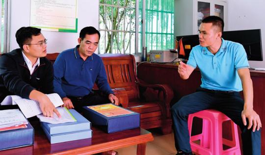 在海南省瓊中黎族苗族自治縣灣嶺鎮(zhèn)加章村委會,紀(jì)檢監(jiān)察干部(左一)在查閱鄉(xiāng)村振興及村級財務(wù)支出相關(guān)材料(2021 年 11 月13 日攝) 楊冠宇攝 / 本刊