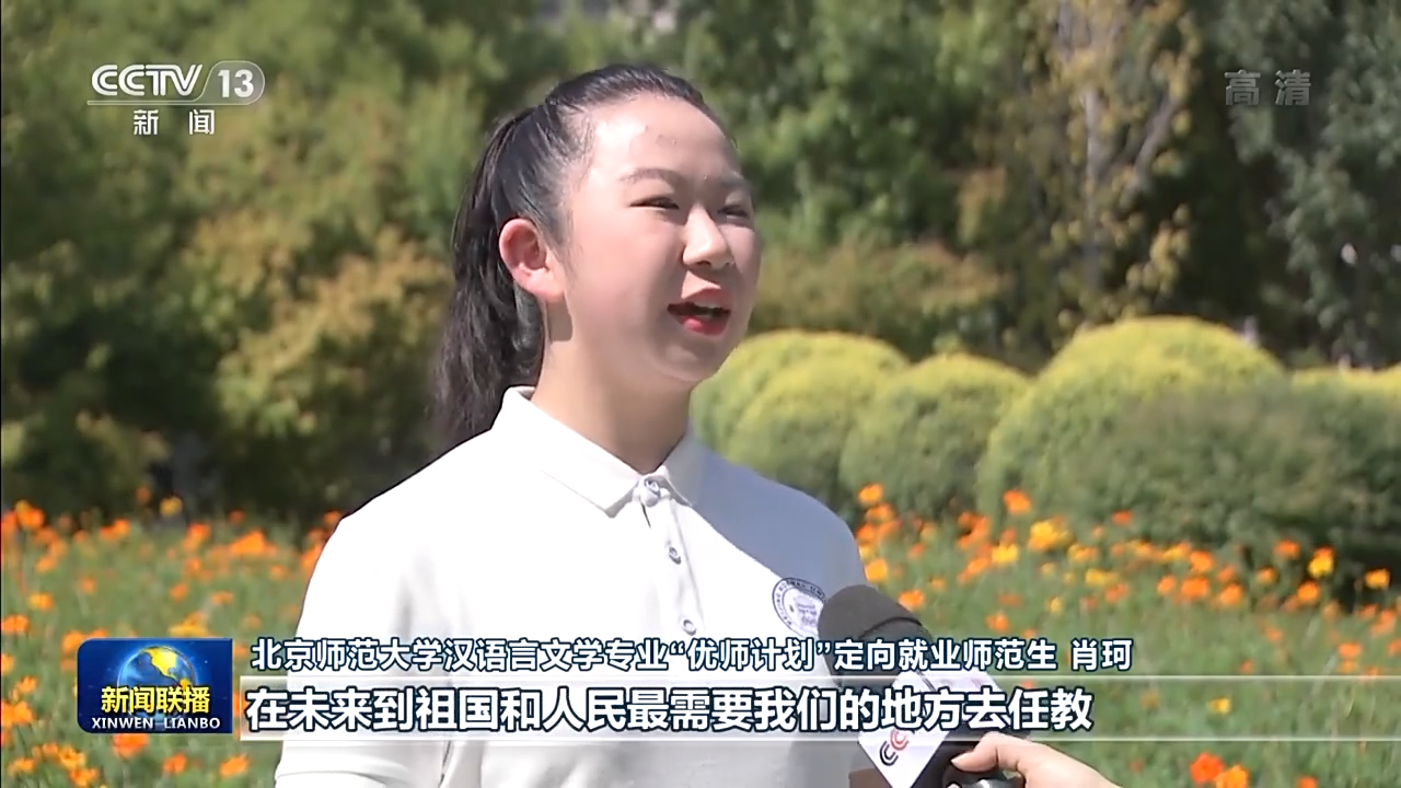 北京師范大學(xué)漢語言文學(xué)專業(yè)“優(yōu)師計(jì)劃”定向就業(yè)師范生 肖珂:總書記勉勵(lì)我們增長傳道授業(yè)解惑本領(lǐng),在未來到祖國和人民最需要我們的地方去任教。我定不負(fù)囑托,努力學(xué)習(xí),在畢業(yè)后回到我的家鄉(xiāng)。