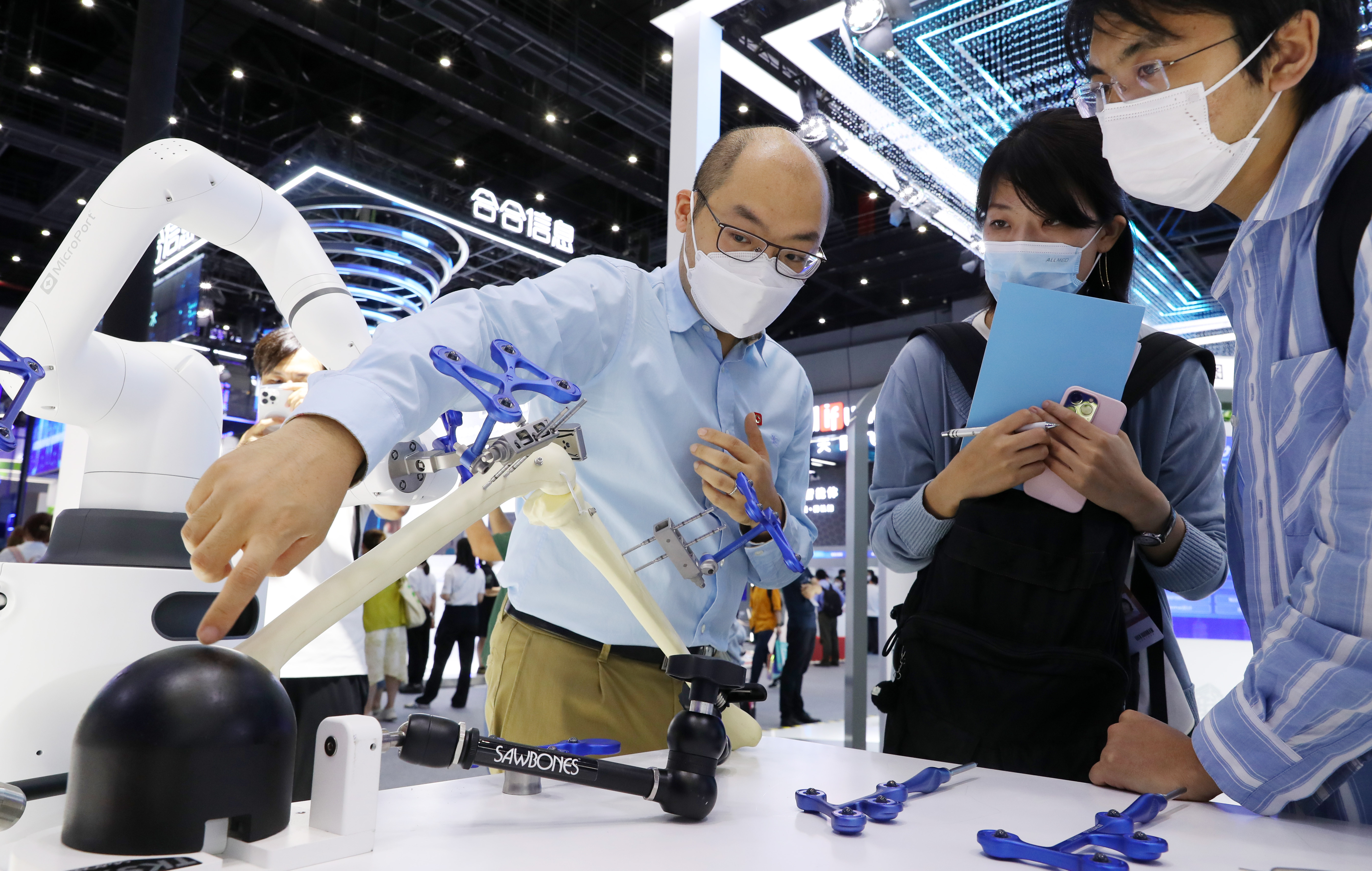 2022年9月1日,工作人員(左一)向參觀者介紹微創(chuàng)骨科手術(shù)機(jī)器人。當(dāng)日,2022世界人工智能大會(huì)在上海世博中心拉開帷幕。新華社記者 方喆 攝