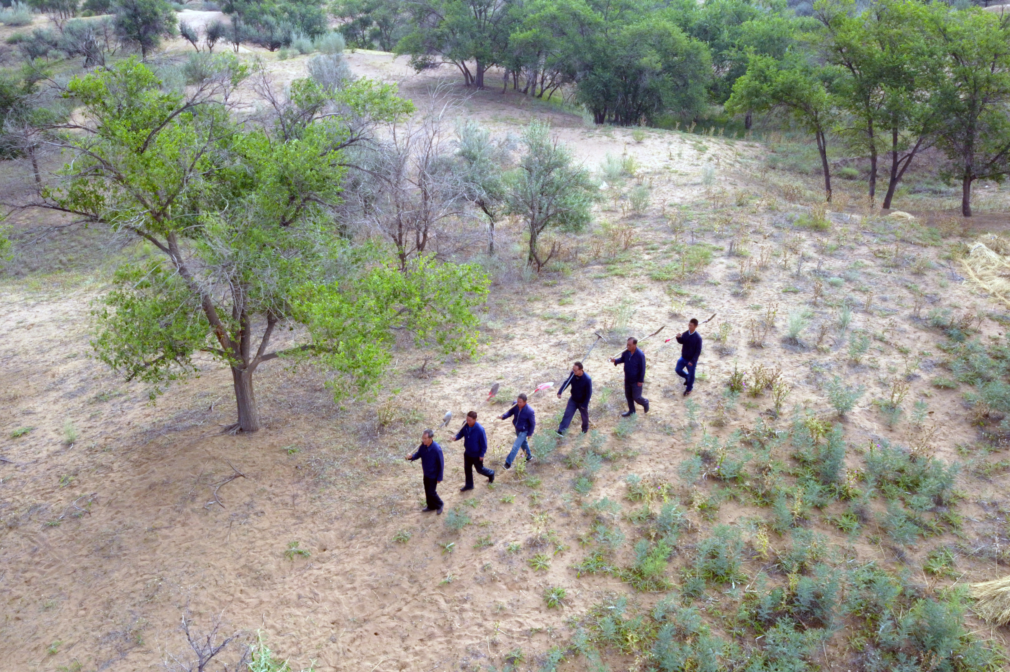 在甘肅省武威市古浪縣八步沙林場(chǎng),場(chǎng)長(zhǎng)郭萬(wàn)剛(左一)和大家一起前往治沙點(diǎn)(2019年8月23日攝,無(wú)人機(jī)照片)。新華社記者 范培珅 攝