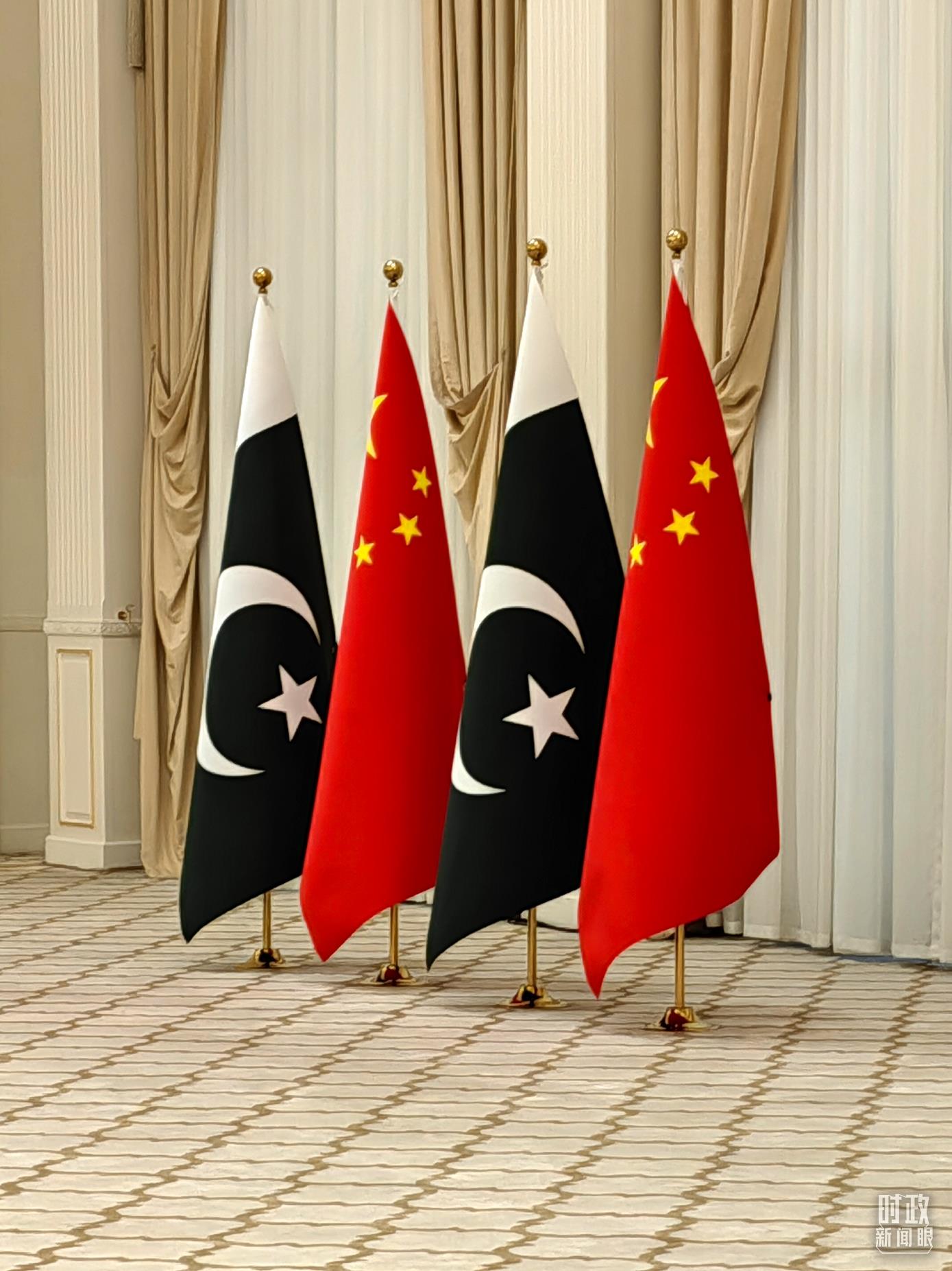 △中巴會(huì)見現(xiàn)場(chǎng)的兩國(guó)國(guó)旗。(總臺(tái)央視記者張曉鵬拍攝)