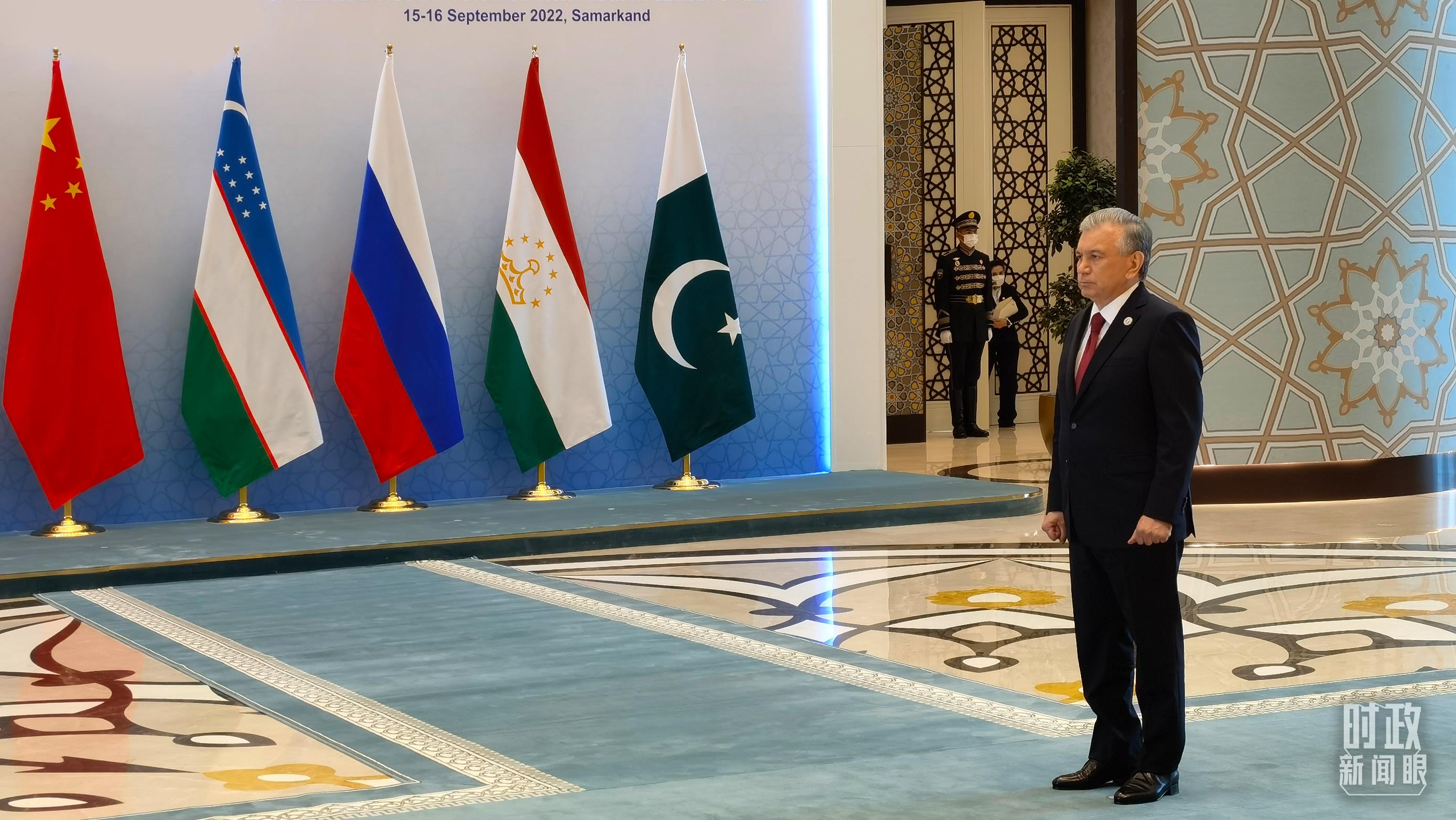 當(dāng)天上午,烏茲別克斯坦總統(tǒng)米爾濟(jì)約耶夫作為主席國(guó)元首提前來(lái)到現(xiàn)場(chǎng),準(zhǔn)備迎接各國(guó)領(lǐng)導(dǎo)人的到來(lái)。