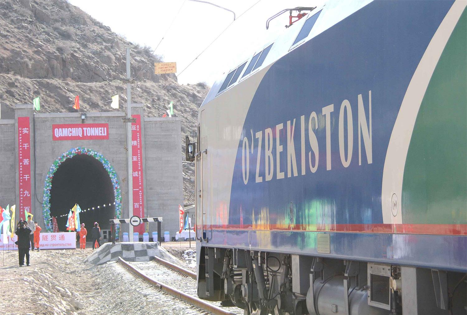 2016年2月27日,一列專列停在烏茲別克斯坦安格連-帕普鐵路卡姆奇克隧道進(jìn)口。新華社記者 沙達(dá)提 攝