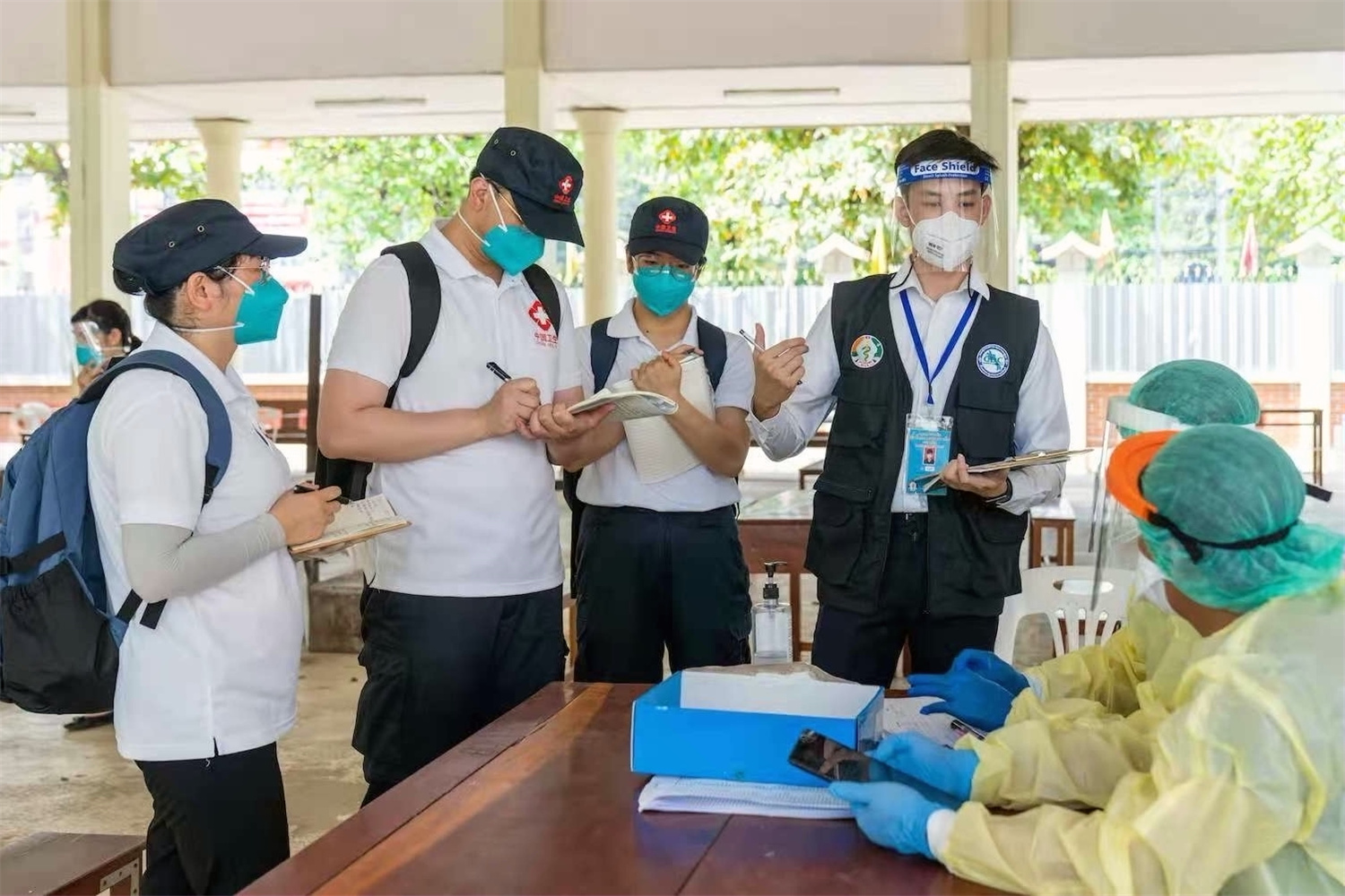 2021年5月7日,中國政府醫(yī)療專家組在老撾首都萬象考察一個(gè)新冠病毒采樣點(diǎn),了解采樣流程、信息采集、密切接觸者判定標(biāo)準(zhǔn)和環(huán)境消毒等情況。新華社發(fā)(中國政府醫(yī)療專家組供圖)