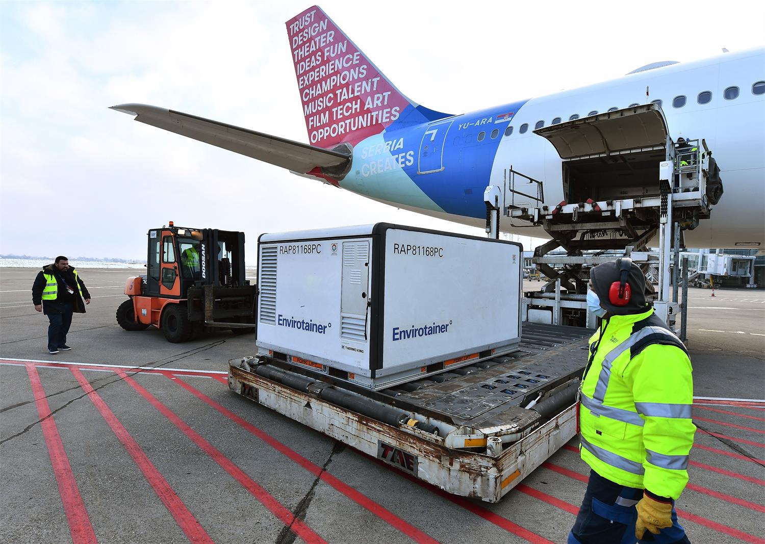 2021年1月16日,在塞爾維亞首都貝爾格萊德,機(jī)場(chǎng)工作人員卸載由中國國藥集團(tuán)生產(chǎn)的新冠疫苗。新華社發(fā)(普雷德拉格·米洛薩夫列維奇攝)
