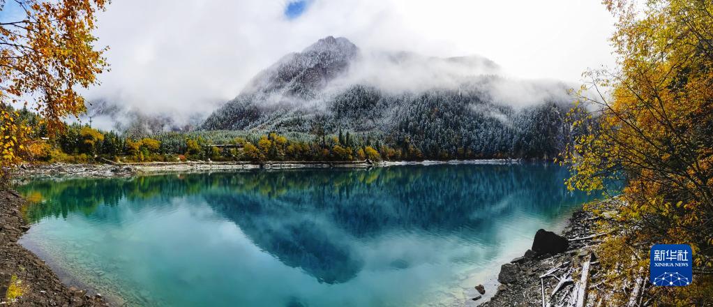 這是10月7日在世界自然遺產(chǎn)地九寨溝拍攝的雪后景色(拼接照片)。新華社發(fā)(梁楓 攝)
