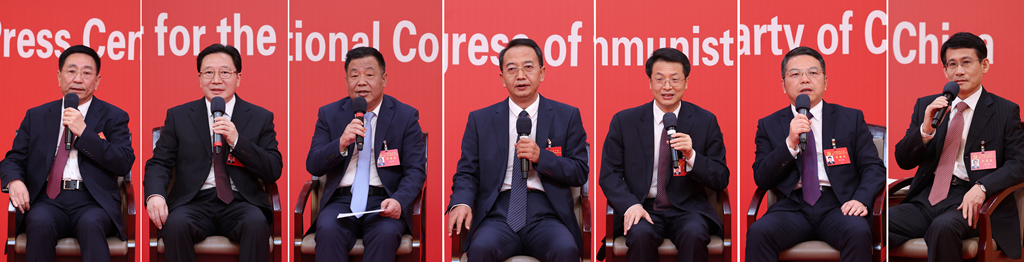 10月19日,中國共產(chǎn)黨第二十次全國代表大會新聞中心舉行集體采訪。山東、河南、湖北、湖南、廣東、廣西、海南代表團新聞發(fā)言人出席,介紹代表團學(xué)習(xí)討論二十大報告情況,并回答記者提問(拼版照片)。新華社記者 張玉薇 攝