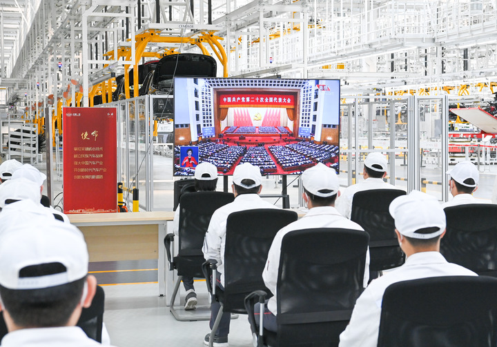 10月16日,在吉林省長(zhǎng)春市中國(guó)第一汽車(chē)集團(tuán)有限公司紅旗繁榮工廠,職工在收看中國(guó)共產(chǎn)黨第二十次全國(guó)代表大會(huì)開(kāi)幕會(huì)。新華社記者 顏麟蘊(yùn) 攝