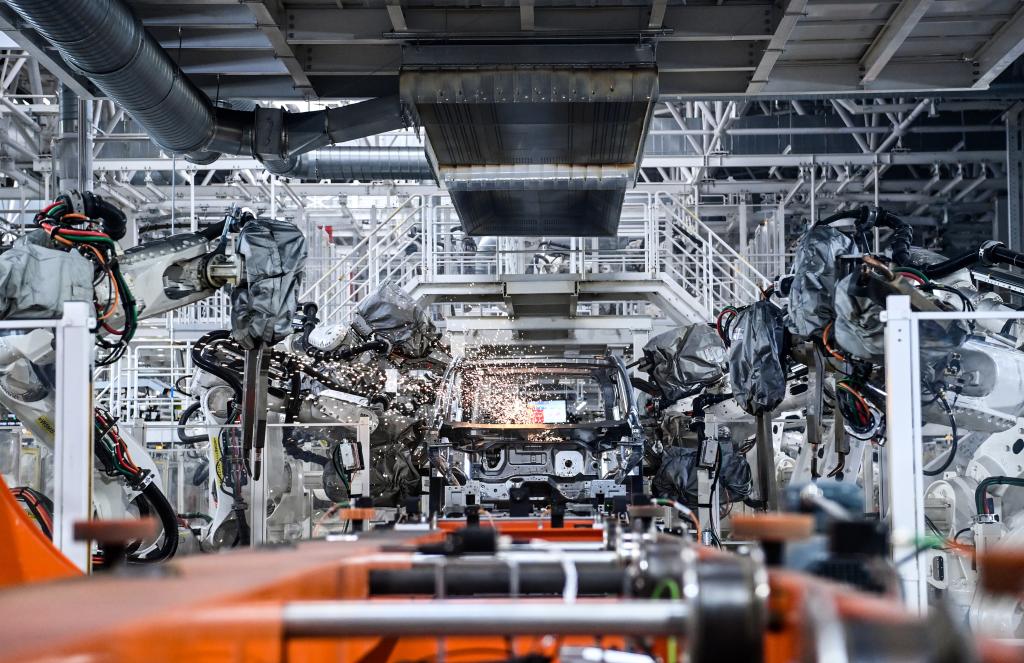 10月17日,在吉林長(zhǎng)春中國(guó)第一汽車(chē)集團(tuán)有限公司紅旗繁榮工廠焊裝車(chē)間內(nèi),焊裝機(jī)器人在生產(chǎn)線上焊接車(chē)身。新華社記者 顏麟蘊(yùn) 攝