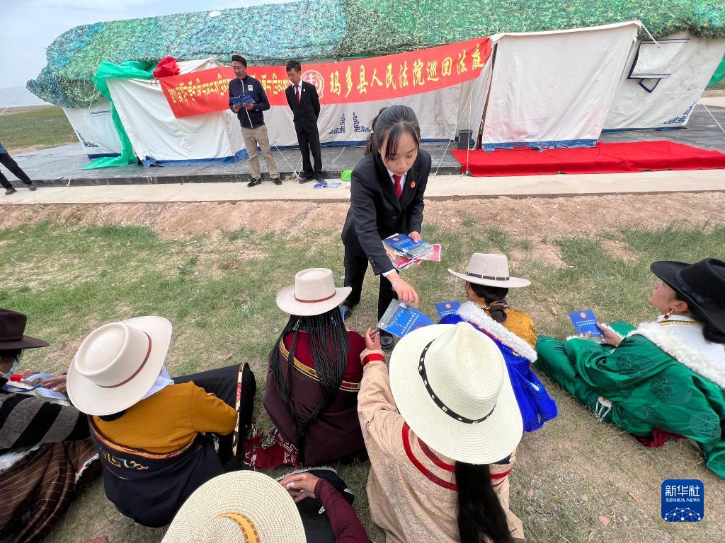 2022年7月12日,在瑪多縣冬格措納湖畔,當(dāng)?shù)啬撩袢罕娫诼牞敹嗫h人民法院巡回法庭法律宣講。新華社發(fā)