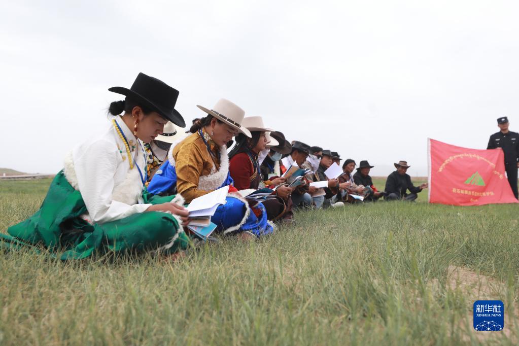 2022年7月12日,在瑪多縣花石峽鎮(zhèn)吉日邁村,瑪多縣人民法院立案庭庭長才偵措(中)在開展環(huán)境保護(hù)相關(guān)法律宣傳。新華社發(fā)