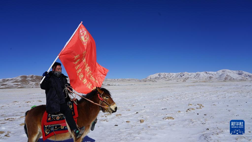 2021年12月20日,瑪多縣人民法院院長錢快乾騎著馬,擎著“瑪多法院巡回法庭”的旗子,下鄉(xiāng)進(jìn)行普法宣傳。新華社發(fā)