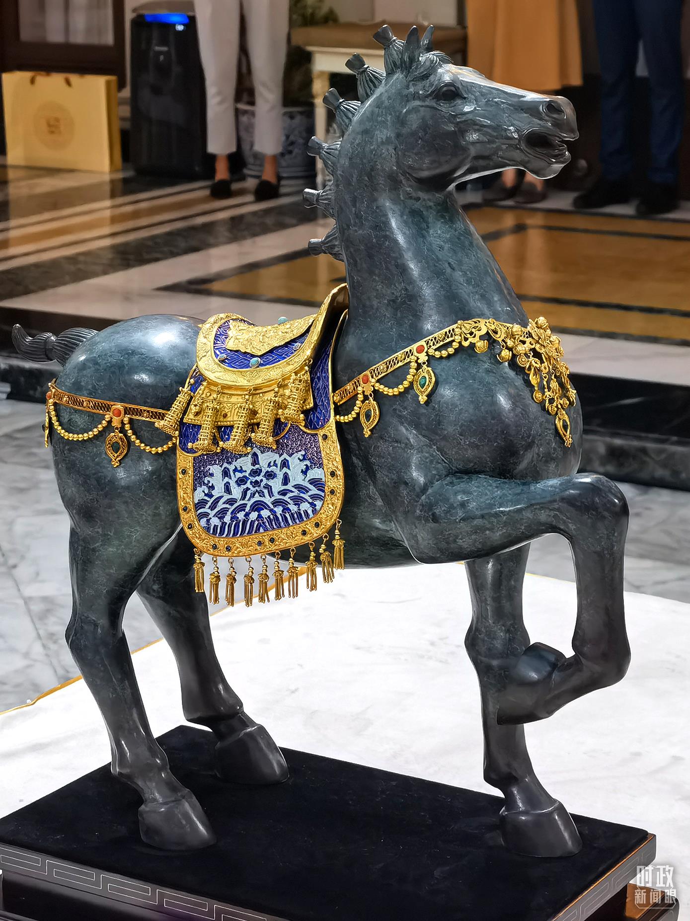 △這是習(xí)近平送給巴育的國禮之一,將軍馬《金玉滿堂》。馬身裝飾以花絲、松石,寓意登高臨風(fēng)、前路暢通。(總臺央視記者馬超拍攝)