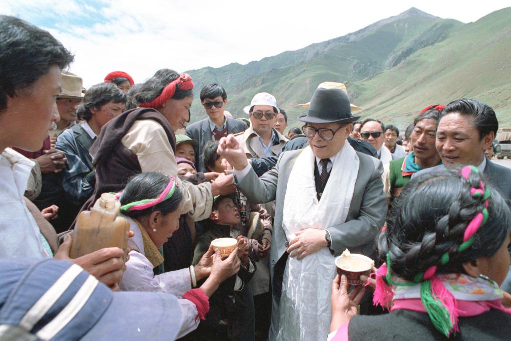 1990年7月25日,江澤民同志與藏族群眾共慶望果節(jié)。新華社發(fā)