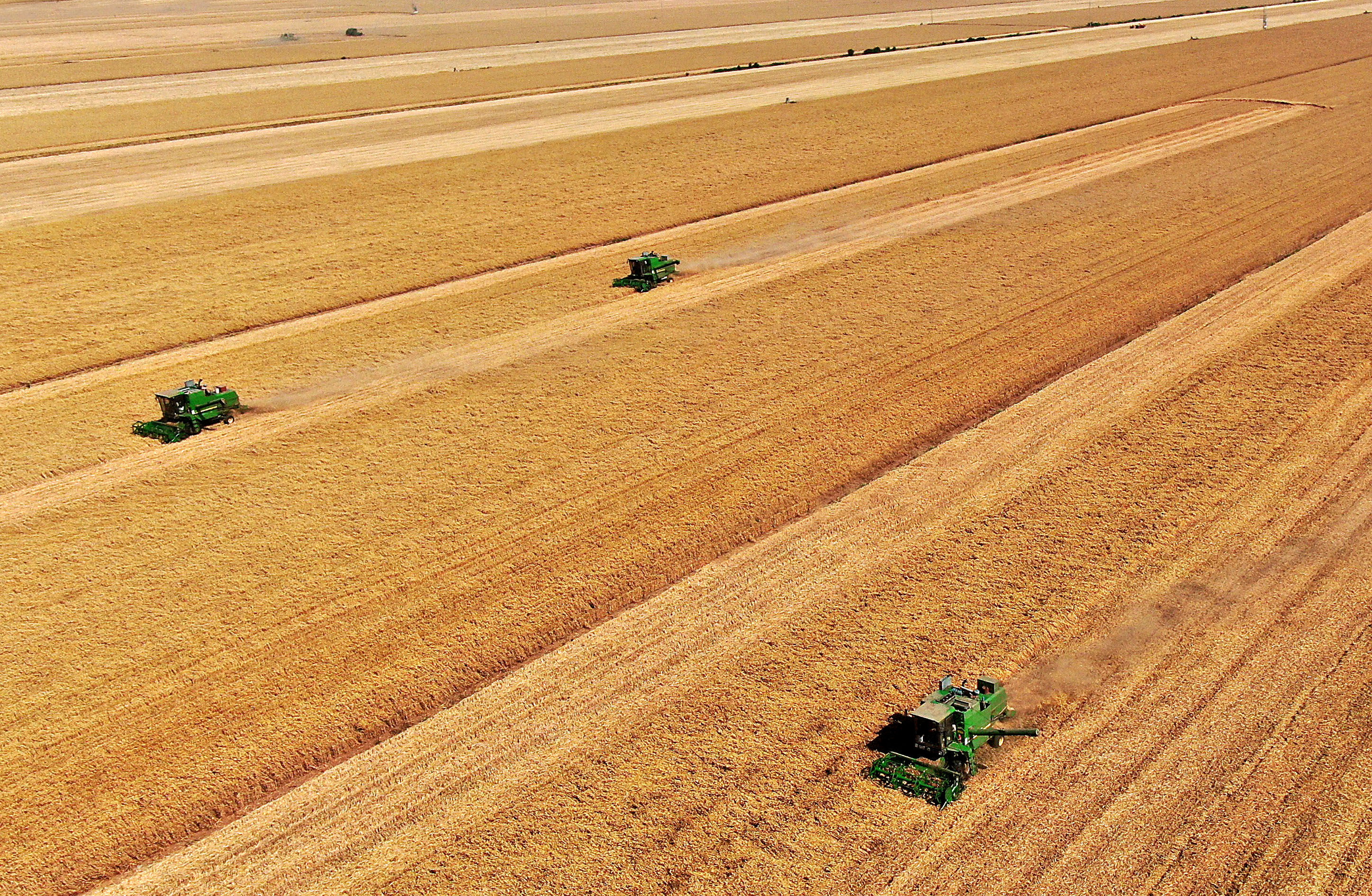 在河南省黃泛區(qū)農(nóng)場九分場的麥田里,農(nóng)機(jī)手操作收割機(jī)收獲小麥(2021年6月6日攝,無人機(jī)照片)。新華社記者 李安 攝