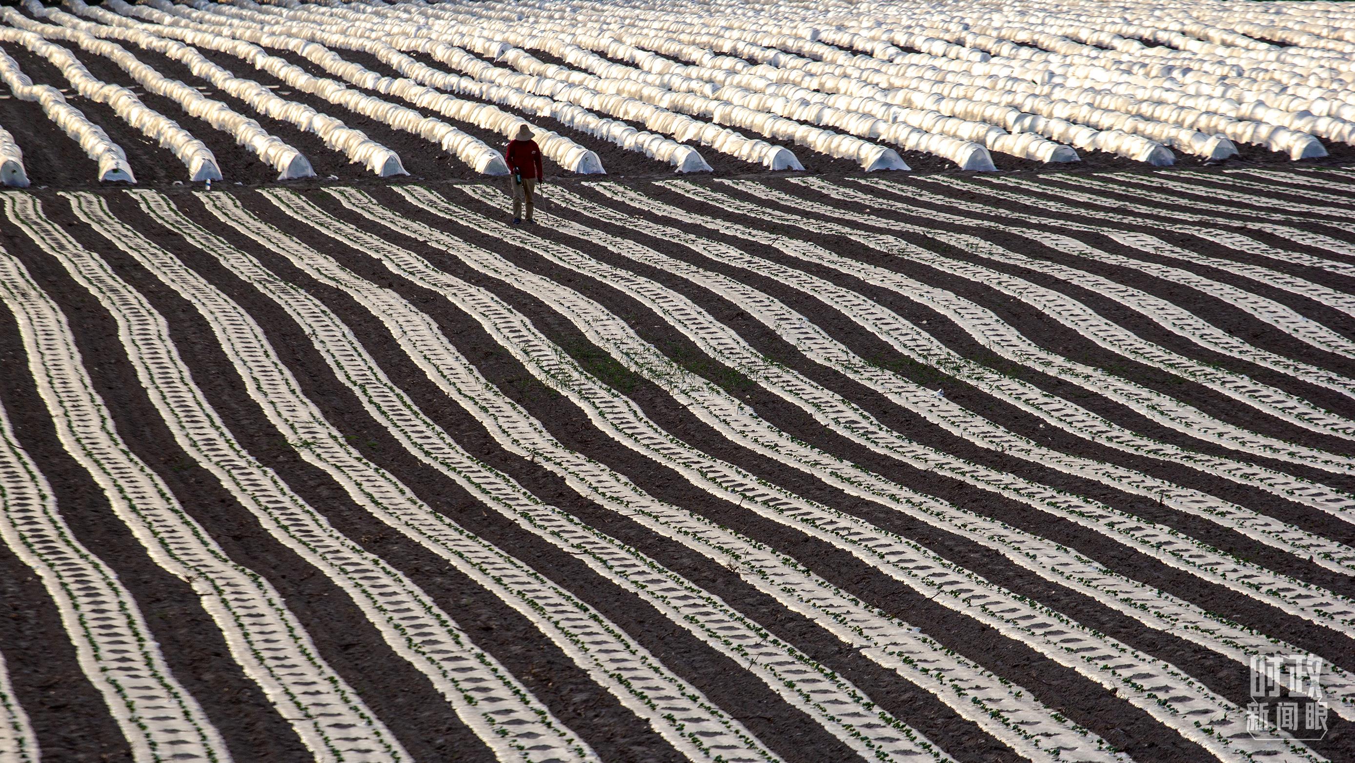 △山西省運城市農(nóng)民在田間覆膜播種西瓜。(圖/視覺中國)
